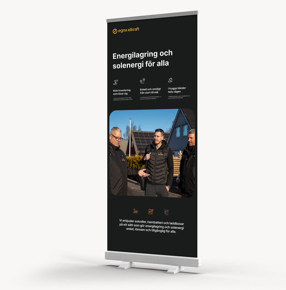 Ett av de sätt som Egna Elkraft särskiljer sig är det höga servicegraden, där bolaget går den extra milen för att vara tillgängliga och ge support också efter färdigställd installation. Något som behövs för att kunderna ska få ut den fulla potentialen av sitt nya system.Genom att dokumentera kundresan och installationer kunde vi visa på den positiva påverkan Egna Elkraft har på sina kunders vardag och ekonomi, men också deras genuina närvaro också efter installationens avslut. Materialet används i kampanjer, sociala medier och på webbplatsen för att tydliggöra varumärkets arbetssätt och särskiljande attribut.Vi tog också fram idéburna kampanjfilmer som speglar hur Egna Elkrafts lösningar påverkar vardagen – från duschvärme till pizzakvällar